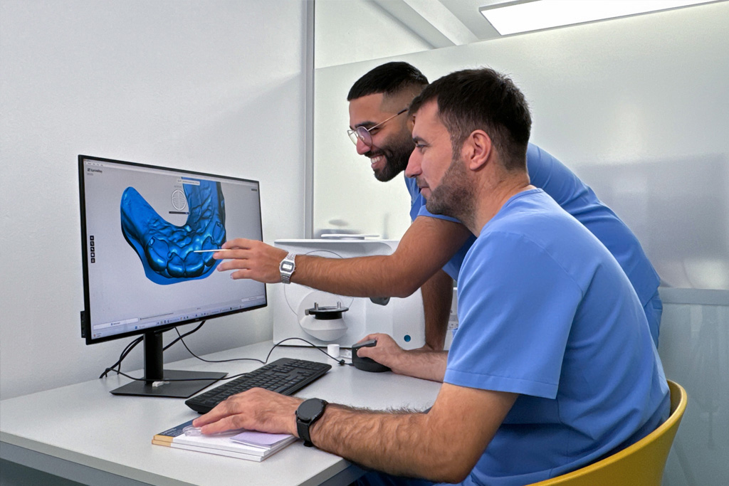 Das hochpräzise 3D-Modell, das mithilfe eines kontaktlosen Intraoralscanners erstellt wurde, dient als exakte Grundlage für die Arbeit unserer Zahntechniker. In unserem praxiseigenen Meisterlabor wird jeder Zahnersatz individuell gefertigt und in einem letzten Behandlungsschritt fest auf den Implantaten verankert. Je nach Bedarf kann dieser aus einer einzelnen Keramikkrone, einer Brücke oder einer vollständigen Zahnprothese bestehen.