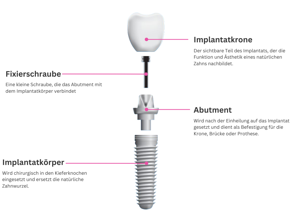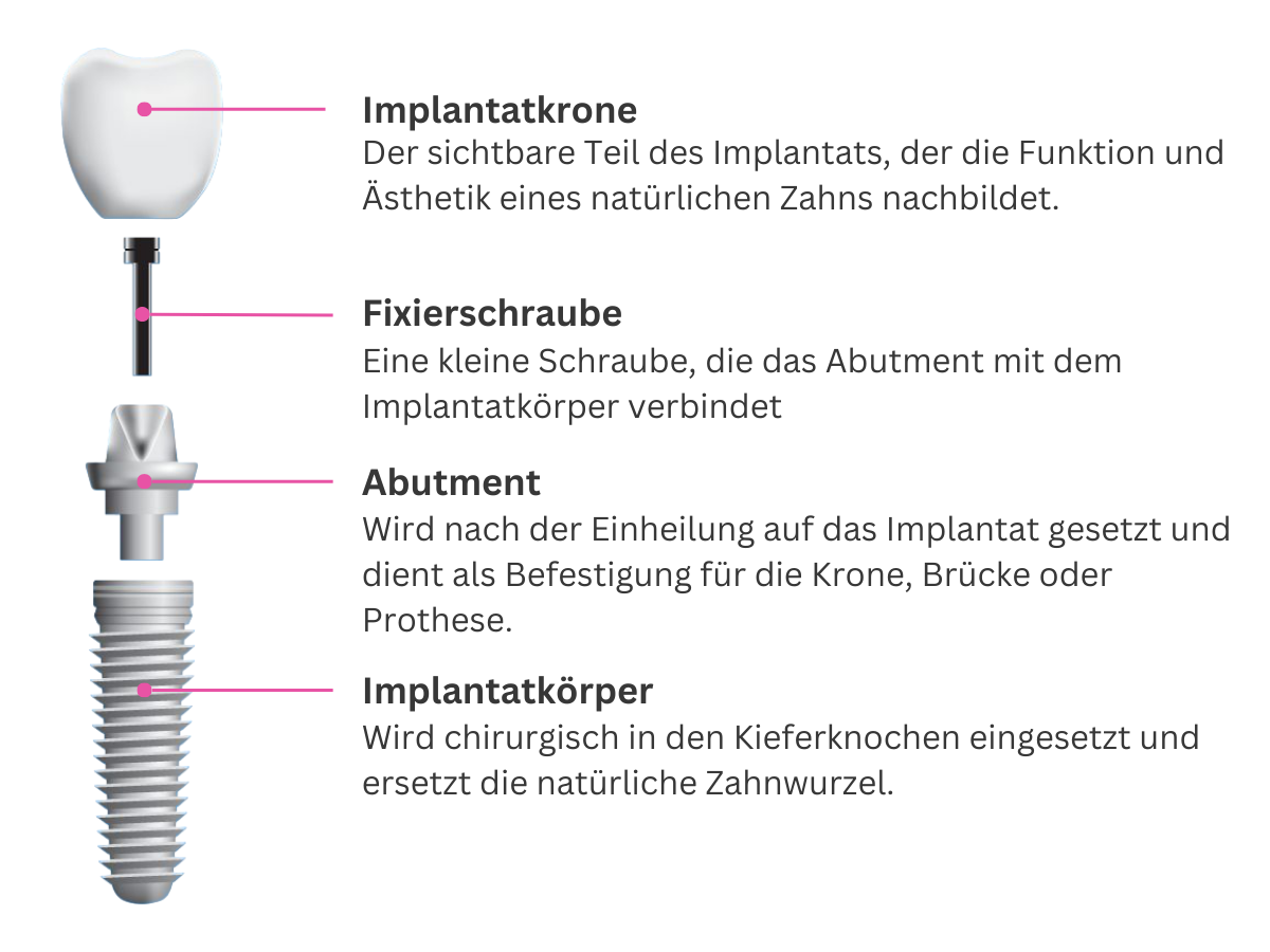 Zahnimplantate werden chirurgisch als künstliche Zahnwurzel im Kieferknochen verankert und fungieren als direkter Ersatz für die natürliche Wurzel des fehlenden Zahnes. Sobald die Implantate fest mit dem Kieferknochen verwachsen sind, bieten sie eine zu echten Zähnen vergleichbare Stabilität und können mit dem gewünschten Zahnersatz bestückt werden. Dieser kann entweder aus einer einzelnen, künstlichen Zahnkrone, einer Brücke aus bis zu 4 Zähnen oder einer kompletten Prothese bestehen.