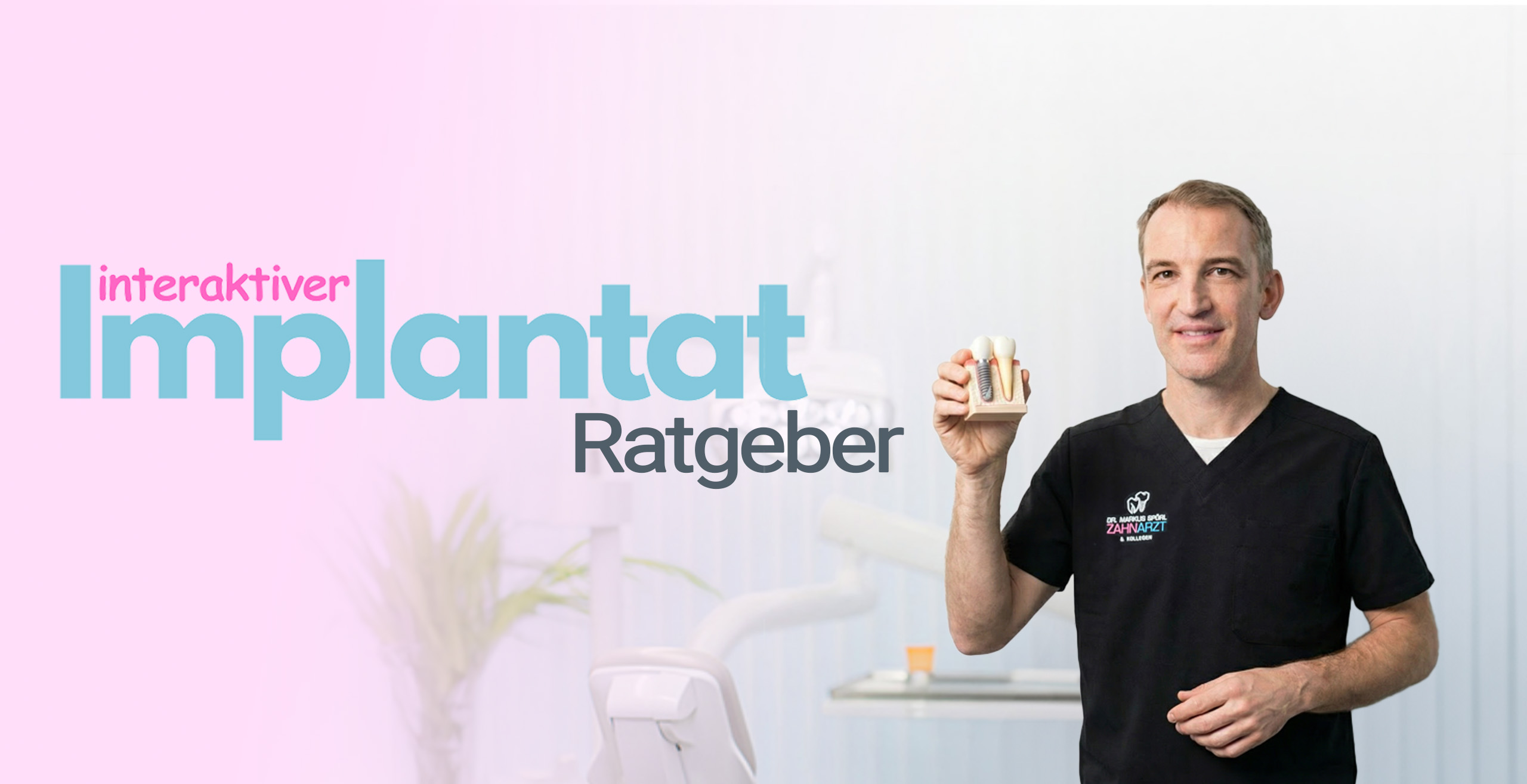 Sie sind noch unsicher, ob und welche Implantate für Sie infrage kommen? Kein Problem, genau dafür gibt es unseren interaktiven Implantat-Guide. Im Dialog mit unserem behandelnden Implantologen Dr. Markus Spörl erhalten Sie verständliche Antworten und eine erste Einschätzung zu Ihrer Situation. Bitte beachten Sie, dass dieser Guide lediglich eine erste Orientierung bietet und ein persönliche Beratungsgespräch sowie die individuelle medizinische Beurteilung durch einen Zahnarzt nicht ersetzen kann.