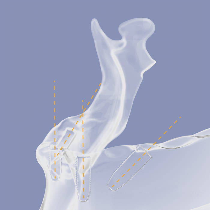 Bei All-on-4® hingegen wird der Kiefer noch am Tag der OP mit einem festsitzenden, gaumenfreien Zahnersatz versorgt und ist sofort belastbar. Um eine stabile Sofortversorgung auf nur 4 Implantaten pro Zahnbogen ermöglichen zu können, werden längere und stabilere Hochleistungsimplantate mit spezieller Form und Oberfläche verwendet. Um den vorhandenen Kieferknochen optimal ausnutzen zu können, sind die zwei hinteren Implantate in einem 30- bis 45-Grad-Winkel abgewinkelt. Dadurch wird der kritische hintere Kieferknochenbereich, in dem die Gefühlsnerven verlaufen, vollständig gemieden und stattdessen der vordere, meist stabilere Knochenbereich ausgenutzt. Das ermöglicht selbst in dünneren und bereits zurückgebildeten Kieferknochen ausreichend Halt und Festigkeit und erspart in fast allen Fällen einen Knochenaufbau. Eine weitere Eigenschaft, die das All-on-4®-Verfahren so attraktiv macht, denn: