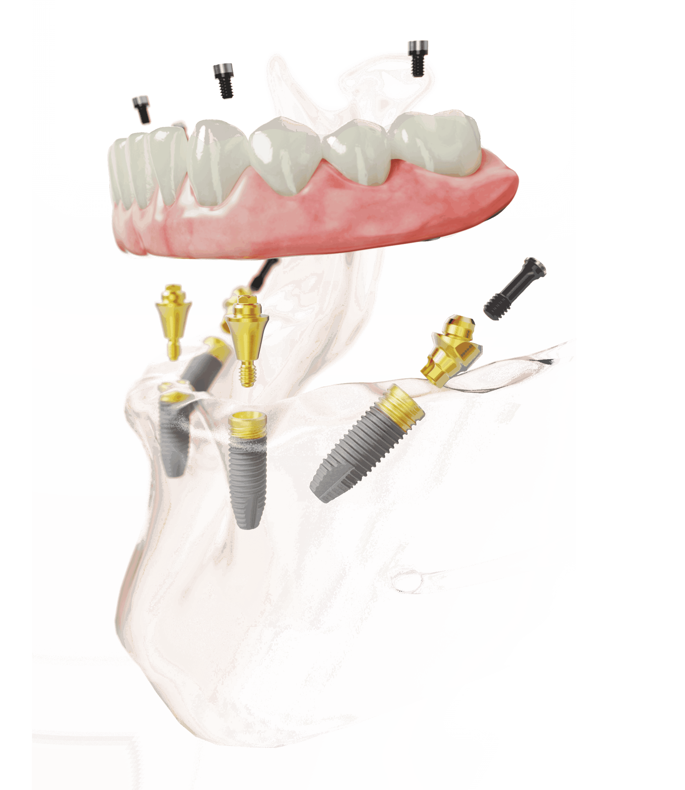 In Schritt 3 wird zunächst ein Bindeglied zwischen dem Implantat und dem Zahnersatz aufgeschraubt, das sogenannte Abutment. Für die hinteren beiden Implantate ist dieses Segment abgewinkelt, um den schrägen Setzwinkel der Implantate auszugleichen und einen ebenen Befestigungspunkt für den eigentlichen Zahnersatz zu bieten. Anschließend wird der vom Zahnlabor angefertigte Heilungszahnersatz fest mit den Implantaten verschraubt. Ab diesem Moment haben Sie bereits neue und belastbare Zähne.