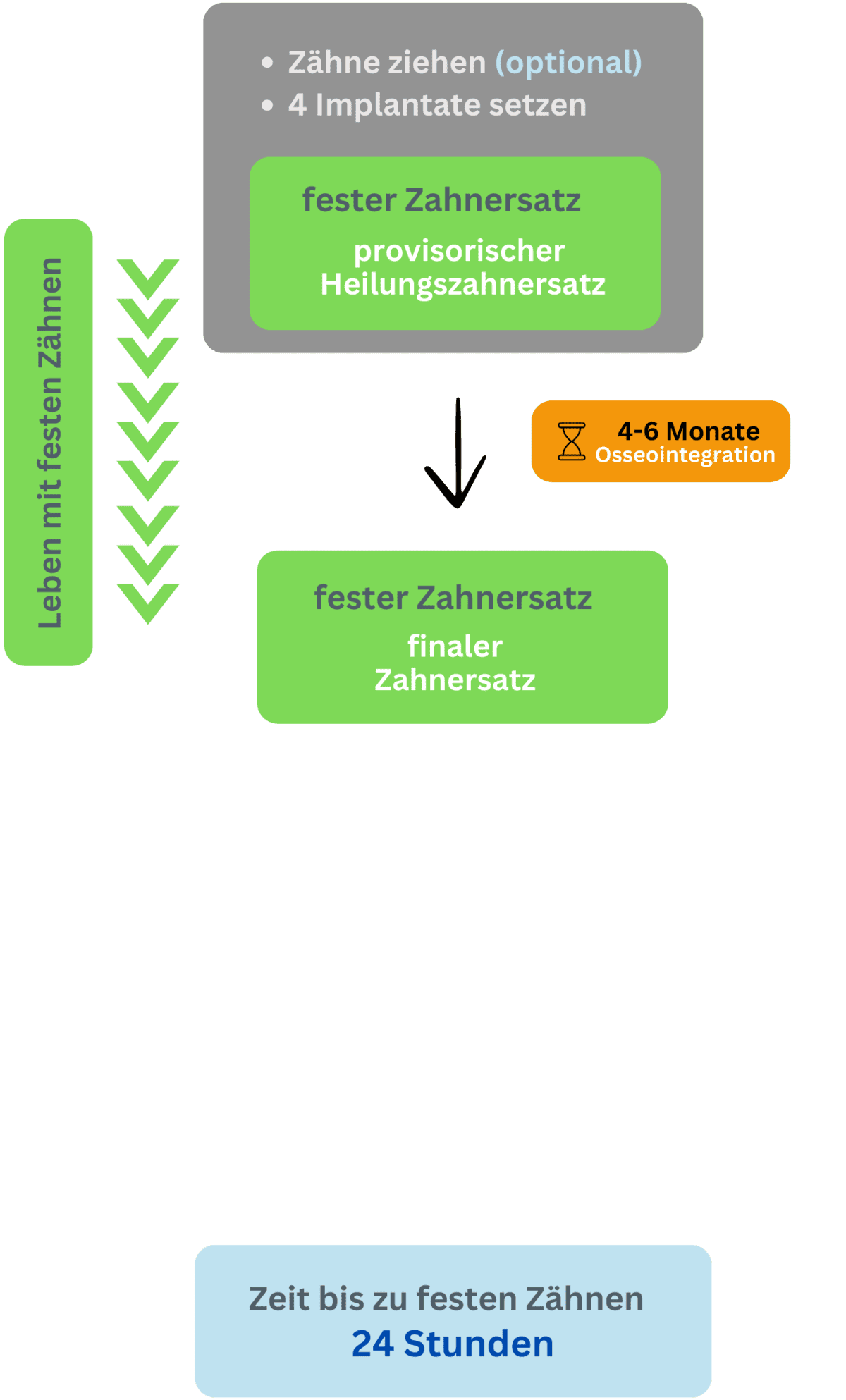 In den nachfolgenden Schaubildern ist der Behandlungszeitraum auf dem Weg zu neuen festen Zähnen exemplarisch dargestellt – einmal auf dem Weg klassischer Implantologie und einmal über All-on-4®. In Abhängigkeit von der Zahnsituation, der allgemeinen gesundheitlichen Verfassung des Patienten, Medikamentierung und finanzieller Aspekte können die einzelnen Schritte und Heilungsphasen natürlich stark variieren und sind deshalb als eines von vielen möglichen Szenerien zu verstehen. Der zeitliche Unterschied beider Methoden bis zum Zeitpunkt fester, belastbarer Zähne bleibt jedoch unabhängig vom exakten Behandlungsablauf signifikant: