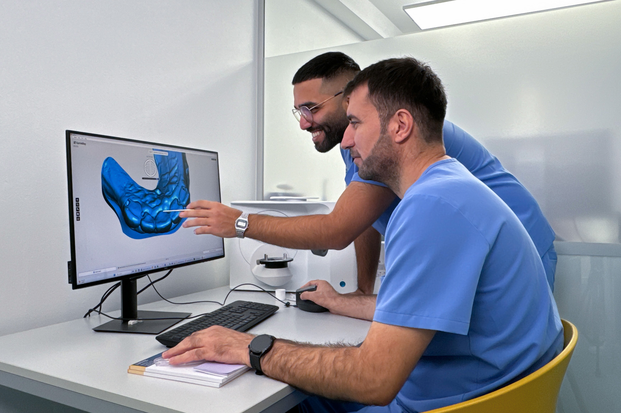 Aus diesem Grund verfügen wir über ein eigenes, meistergeführtes Dentallabor, das mit modernster CAD/CAM-Technologie und 3D-Druckern ausgestattet ist. Unsere qualifizierten Zahntechniker begleiten die Behandlung direkt vor Ort, passen den Zahnersatz am Behandlungsstuhl präzise an die individuelle Kiefersituation an und können direkt im Anschluss ohne jegliche Verzögerung mit der Fertigung beginnen. Während des gesamten All-on-4®-Verfahrens arbeiten unsere Implantologen eng und kontinuierlich mit dem Zahntechnikerteam zusammen.